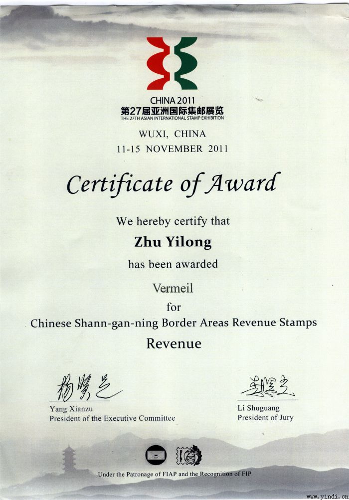 银帝艺术馆馆藏《中国陕甘宁边区印花税票》邮集斩获中国2011—第27届亚洲国际邮展镀金奖
