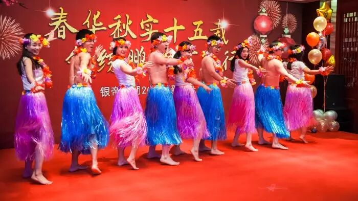 来自集团总部的员工带来了别出心裁手语节目《习主席寄语》;歌曲《大中国》、《万水千山总是情》将晚会推向了第一波高潮;《沧海一声笑》更是将银帝人侠肝义胆,豪情万丈的精神风貌展现的淋漓尽致;银帝传媒的年轻人用独具异域风情的《草裙舞》将他们朝气蓬勃、热情洋溢的青春活力传递给在场所有观众;美少女组合带来的《继续给十五岁的自己》送给即将到来的银帝集团十五岁的生日,在歌声中勾起银帝人对十五年来风雨历程的回忆,用细腻的情感将晚会推向另一个高潮。